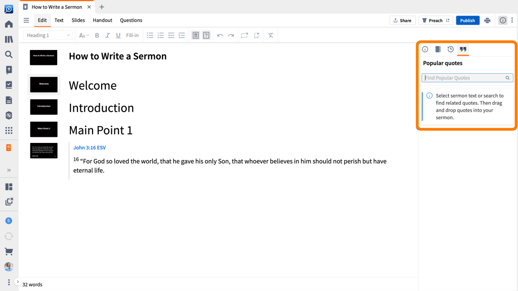 But Al may still want to make the crossover to Sermon Builder, because Logos 10 (Silver and above) has added a new feature that I find quite fun and helpful. In the information panel of Sermon Builder, there is a new Quote Icon that brings up a search box for finding relevant quotes that can be immediately imported into your sermon and presentation. Gone are the days of scouring your library for that one accent quote for your message. Thank you, Logos. My congregation appreciates it!